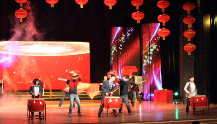 年会开始,我们听到一阵密集的鼓声,舞台慢慢生气,全场一阵欢呼,原来妞妞总经理刘勇、企管主任吴静、营销主任成雪在舞台上擂鼓慢慢升起,后面还有舞狮的、挥舞红旗奔跑的高管,现场气氛一下被点燃,鼓声敲响了妞妞所有伙伴的希望,为2013鼓足了劲头。